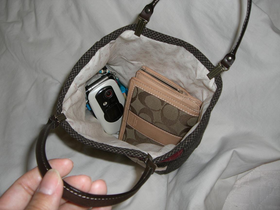 お財布とケータイを入れてみた。デジカメやメモ帳も入りそう。サイズはなかなかよかったみたい。